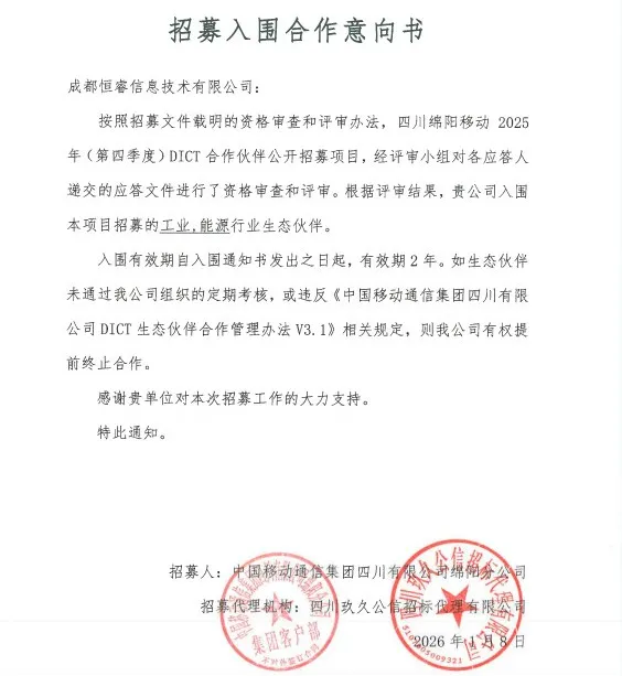 成都恒睿成功入選綿陽移動DICT合作伙伴
