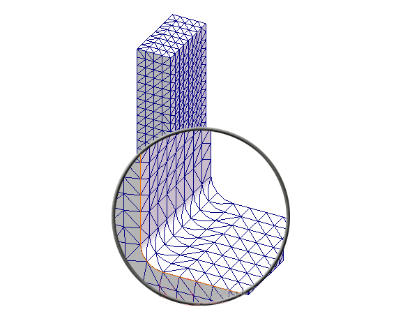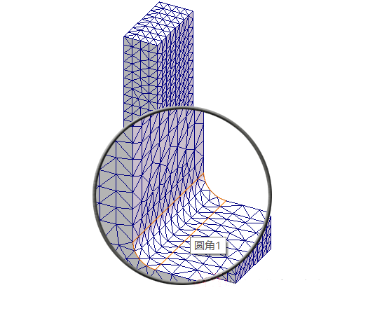 此模型最小的特征為圓角位置,可以觀察到,圓角位置,網(wǎng)格層數(shù),勉強(qiáng)顯示為2層,圓角大小是5mm,是無(wú)法完全劃分出2個(gè)4mm的網(wǎng)格的。在此位置,需要更小的網(wǎng)格劃分。根據(jù)2層以上的經(jīng)驗(yàn)值,我們可以“應(yīng)用網(wǎng)格控制”,在此位置劃分2.5mm的網(wǎng)格大小,效果如下圖