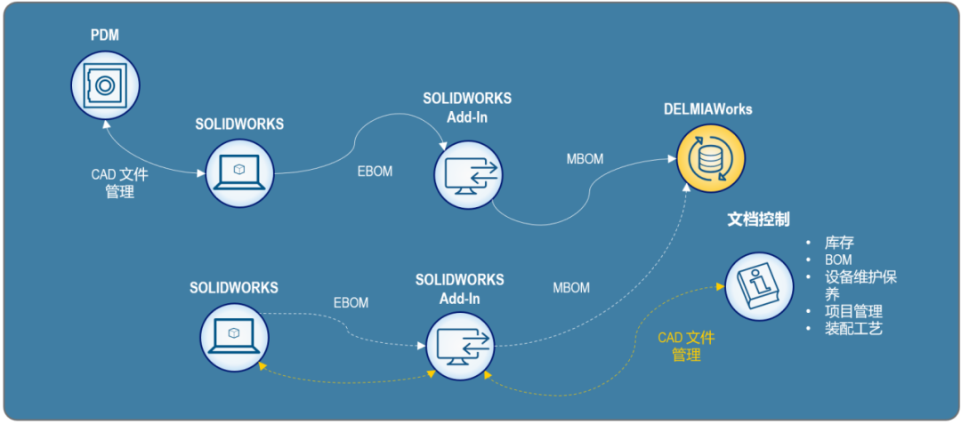 這個解決方案將SOLIDWORKS與數(shù)據(jù)管理系統(tǒng)(PDM/PLM)結(jié)合,進(jìn)一步將DELMIAWORKS整合到其中。這種緊密結(jié)合的方式,能夠?qū)崿F(xiàn)從產(chǎn)品設(shè)計到生產(chǎn)驗證過程的高效結(jié)合,包括物料管理、BOM管理、工程變更管理、產(chǎn)品圖文檔指導(dǎo)等。通過這種有機的結(jié)合方式,企業(yè)能夠更高效地傳遞數(shù)據(jù),提高數(shù)據(jù)準(zhǔn)確性和時效性,減少因為信息不及時造成的不必要損失。
