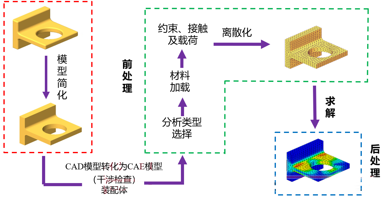 眾所周知,結(jié)構(gòu)仿真按照流程可以分為前處理、求解以及后處理,工程師的工作量主要體現(xiàn)在前處理階段,前處理可能占據(jù)了整個仿真流程的50-60%的工作量。如圖1所示,前處理中包含了模型的簡化、分析類型的選擇、材料的選擇、接觸、約束以及載荷的設(shè)定和網(wǎng)格劃分等流程,本文我們主要關(guān)注Simulation的網(wǎng)格劃分功能以及網(wǎng)格控制。