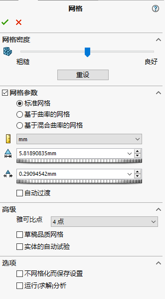 網(wǎng)格密度可以分為粗糙、默認(rèn)以及良好,隨著指針從粗糙到默認(rèn)到良好的拖拽,網(wǎng)格的密度會增加,網(wǎng)格尺寸會變小。該處的指針的拖拽,也會直接影響到下面“網(wǎng)格參數(shù)”中網(wǎng)格大小的量標(biāo)。
