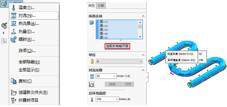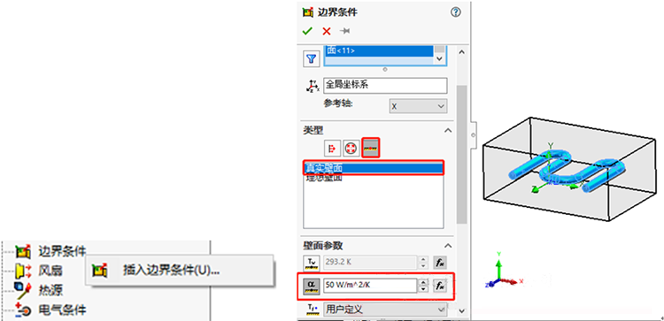 6、設(shè)置對流換熱系數(shù)。在Flow Simulation當中,對流系數(shù)其實是根據(jù)材料的屬性和環(huán)境狀態(tài)換算出來的,因此在計算時,其實對流換熱系數(shù)不是一個定值,這樣的算法更加貼近于實際情況。但是我們也可以進行固定對流換熱系數(shù)的設(shè)置。設(shè)置對流換熱系數(shù)為:50 W/m^2/K。