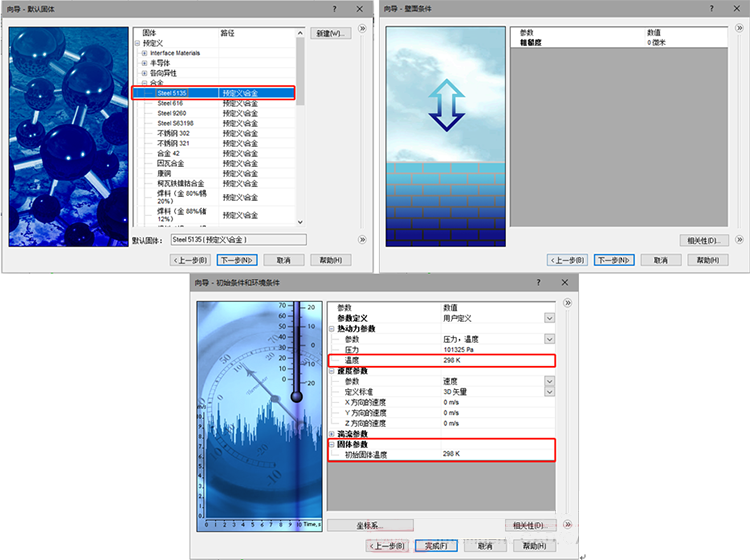 3、固體材料這一步,我們可以先隨便給定一種默認材料。最后再初始條件中,我們確保初始溫度和環(huán)境溫度都設(shè)置為298K。