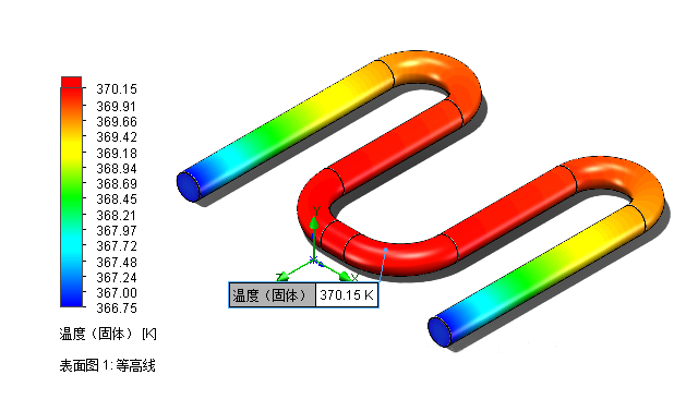 9、完成設(shè)置后,即可提交運算。在結(jié)果里面我們選擇表面圖,以溫度的結(jié)果進行顯示。從圖中我們可以知道模型的最大溫度為370.15K,位于轉(zhuǎn)角處。