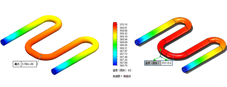 總結(jié):從SOLIDWORKS Simulation和Flow Simulation的結(jié)果看,由于兩個的色階方面不同,過渡方面看起來不一樣,但是實際趨勢和數(shù)值都高度一致,最高溫度為370.2K。而Flow Simulation在流體散熱的算法和材料本構(gòu)關(guān)系上會比Simulation更加優(yōu)勝!