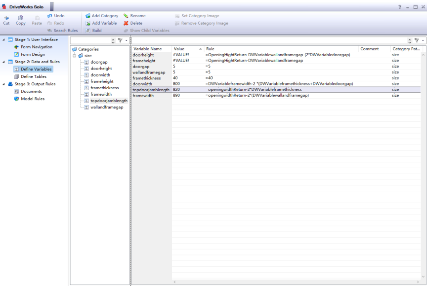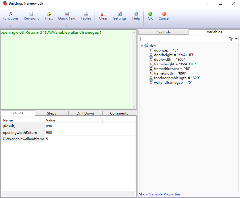 Step2、通過建立變量關(guān)系關(guān)聯(lián)Opening Width和 FrameWith的關(guān)系,即FrameWidth = Opening With – 2*Wall and Frame Gap。其中:Opening Width為輸入變量(墻體寬度),Wall and Frame Gap 為墻體和門框縫隙,Frame Width 為門框?qū)挾取?/span>
