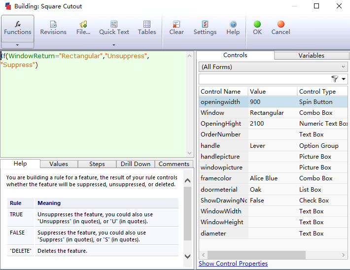 針對于門上的方形窗口特征變量If(WindowReturn="Rectangular ","Unsuppress","suppress"):
