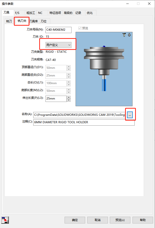 5、在進(jìn)行操作參數(shù)設(shè)置時(shí),在銑刀夾,刀夾設(shè)定中選擇用戶定義,并在名稱中選擇瀏覽到保存的文件,選擇尾綴為.mh文件即可
