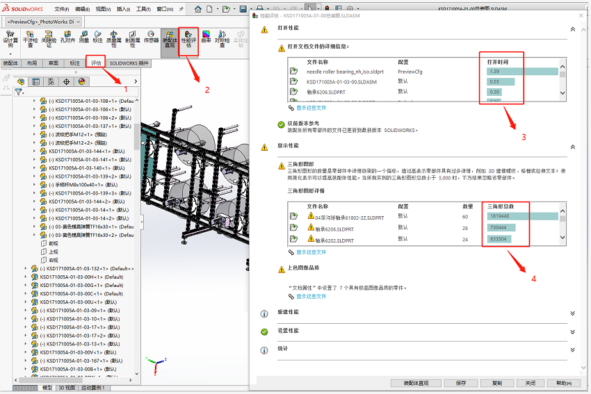 可通過(guò)“評(píng)估”—“性能評(píng)估”,查詢裝配體“打開(kāi)時(shí)間”占比及“三角形總數(shù)”(越大,模型越復(fù)雜);也可進(jìn)入“裝配體直觀”查看;來(lái)檢查裝配是否存在性能問(wèn)題,如下截圖: