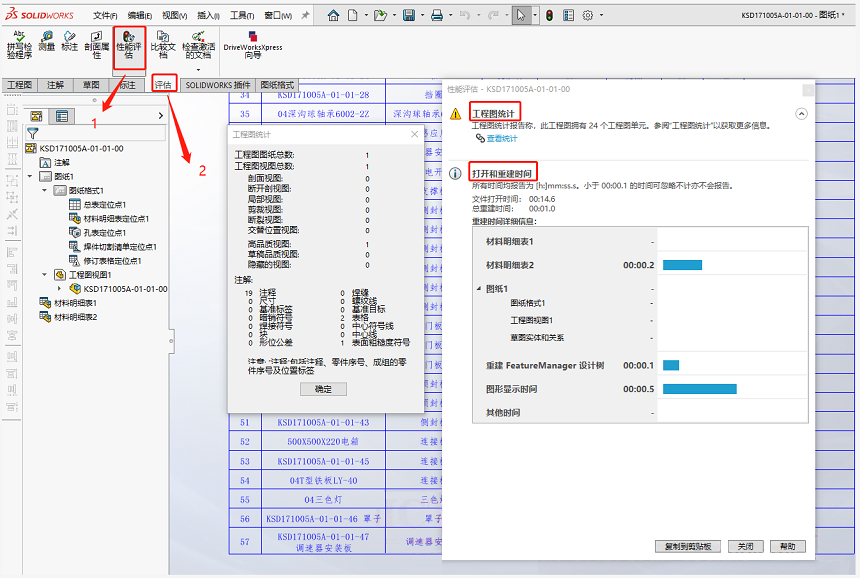 可通過(guò)“評(píng)估”—“性能評(píng)估”,來(lái)檢查工程圖是否存在性能問(wèn)題,如下截圖: