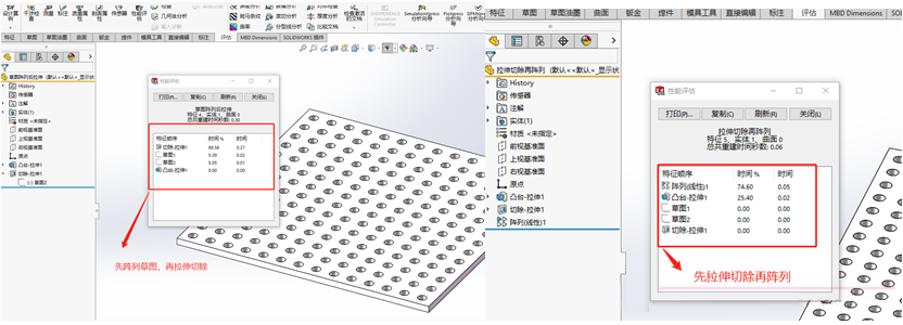 (2)壓縮特征:設(shè)計(jì)的時(shí)候,可使用評(píng)估性能工具將必要的特征壓縮掉,然后繪制新特征或編輯之前的特征,完整零件設(shè)計(jì)后,將這些陣列特征解除壓縮;
