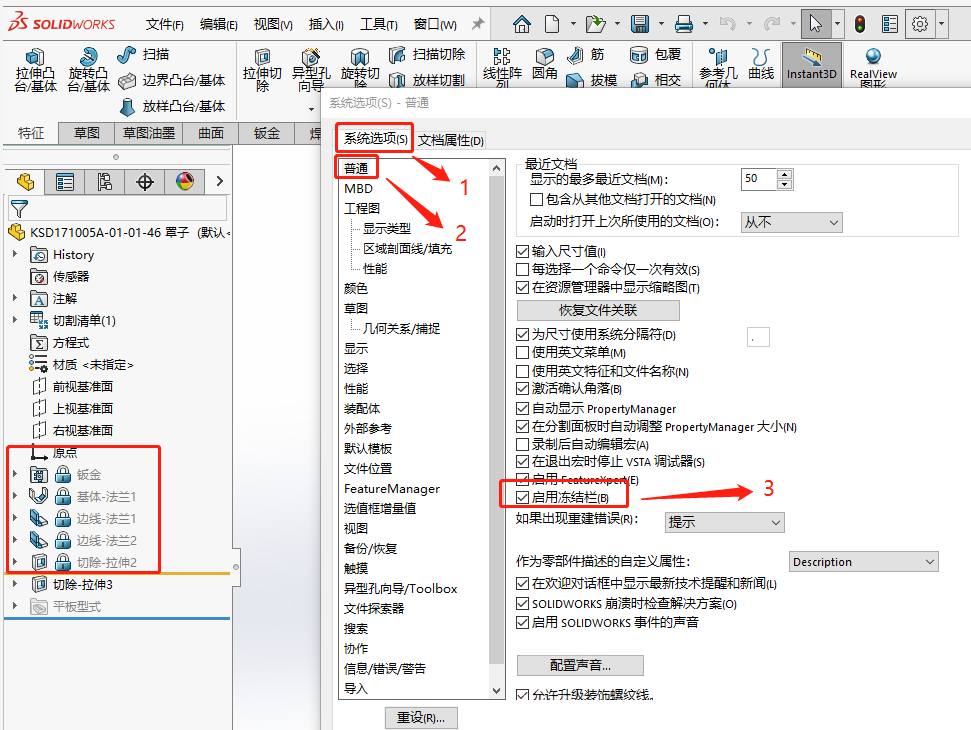 (1)凍結(jié)欄:零件的特征越多,相對(duì)越卡頓,可啟用凍結(jié)欄,建模完,統(tǒng)一對(duì)特征進(jìn)行凍結(jié);