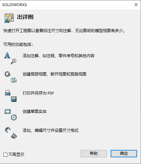 如果您需要對(duì)大型裝配體的工程圖或?qū)ΠS多圖紙、配置或資源密集型視圖的工程圖進(jìn)行較小編輯,出詳圖模式將非常有用;(出詳圖模式用于SOLIDWORKS 2020及更高版本)