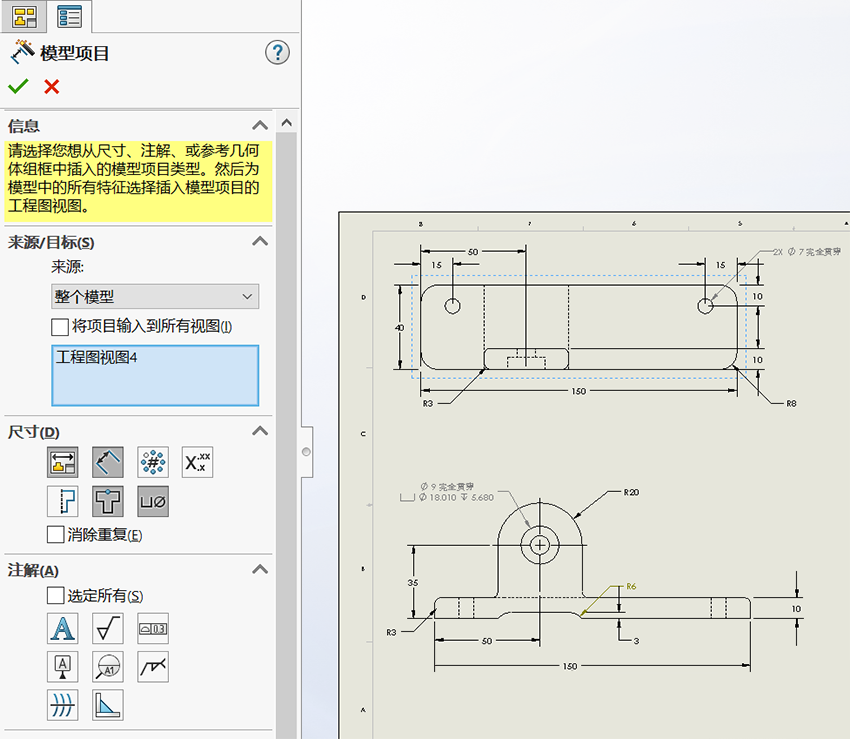 作用:快速標(biāo)注工程圖的尺寸,[模型項(xiàng)目]命令插入尺寸的位置取決于模型創(chuàng)建時(shí)標(biāo)注草圖尺寸放置的位置。