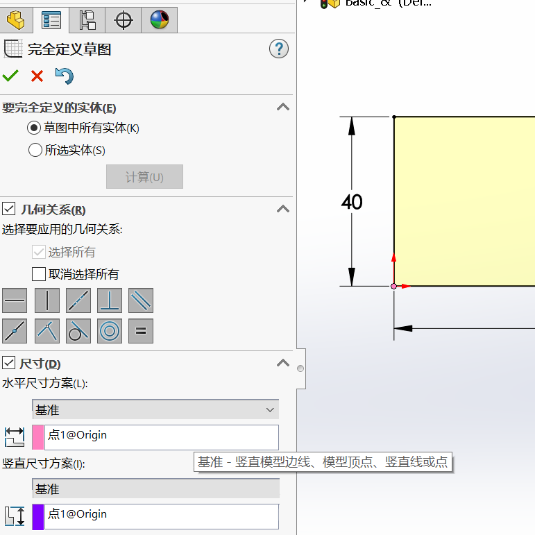 操作:草圖狀態(tài)下,鼠標(biāo)右鍵,單擊【完全定義草圖】,設(shè)置基準(zhǔn)點(diǎn)再點(diǎn)擊“計(jì)算”
