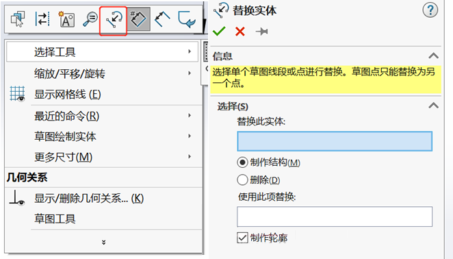 命令:【工具】-【草圖工具】-【替換】/草圖狀態(tài)鼠標(biāo)右鍵