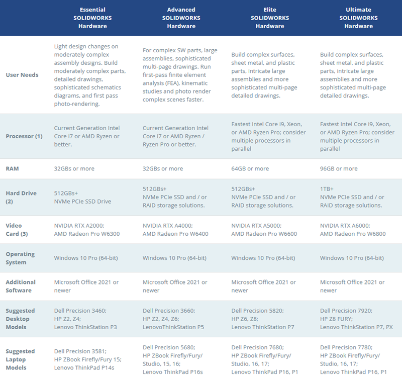 盡管自行構(gòu)建和配置SOLIDWORKS CAD系統(tǒng)(工作站)可能很有趣,但TriMech強(qiáng)烈建議從知名的硬件制造商處購(gòu)買(mǎi)預(yù)配置的系統(tǒng)。這些工作站經(jīng)過(guò)測(cè)試、優(yōu)化并獲得認(rèn)證,可以運(yùn)行諸如SOLIDWORKS之類(lèi)的專(zhuān)業(yè)應(yīng)用程序。您的業(yè)務(wù)時(shí)間最好用于使用SOLIDWORKS設(shè)計(jì)和構(gòu)建優(yōu)秀的設(shè)計(jì),而不是解決與硬件組件的兼容性問(wèn)題。