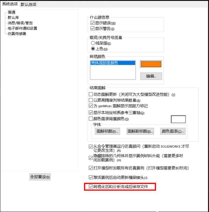 如果在仿真分析過程中遇到停電或者電腦死機(jī)的情況,發(fā)現(xiàn)之前的仿真結(jié)果沒有保存,我想每個(gè)人的內(nèi)心都是崩潰的。在達(dá)索系統(tǒng)SOLIDWORKS 2024 Simulation中,用戶可以在選項(xiàng)里選擇在網(wǎng)格化完成和算例求解完成后自動(dòng)保存,避免了工程師這方面的煩惱。