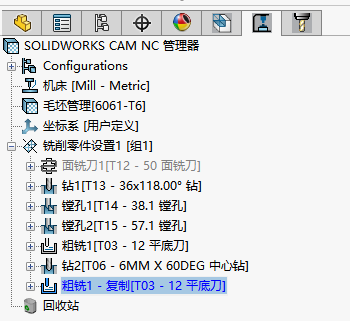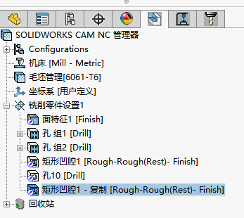 2、可以在SOLIDWORKS CAM設(shè)計(jì)樹中和操作樹中看見被復(fù)制的信息,并且所復(fù)制的加工策略也相同,但操作計(jì)劃需要我們手動(dòng)點(diǎn)擊生成:
