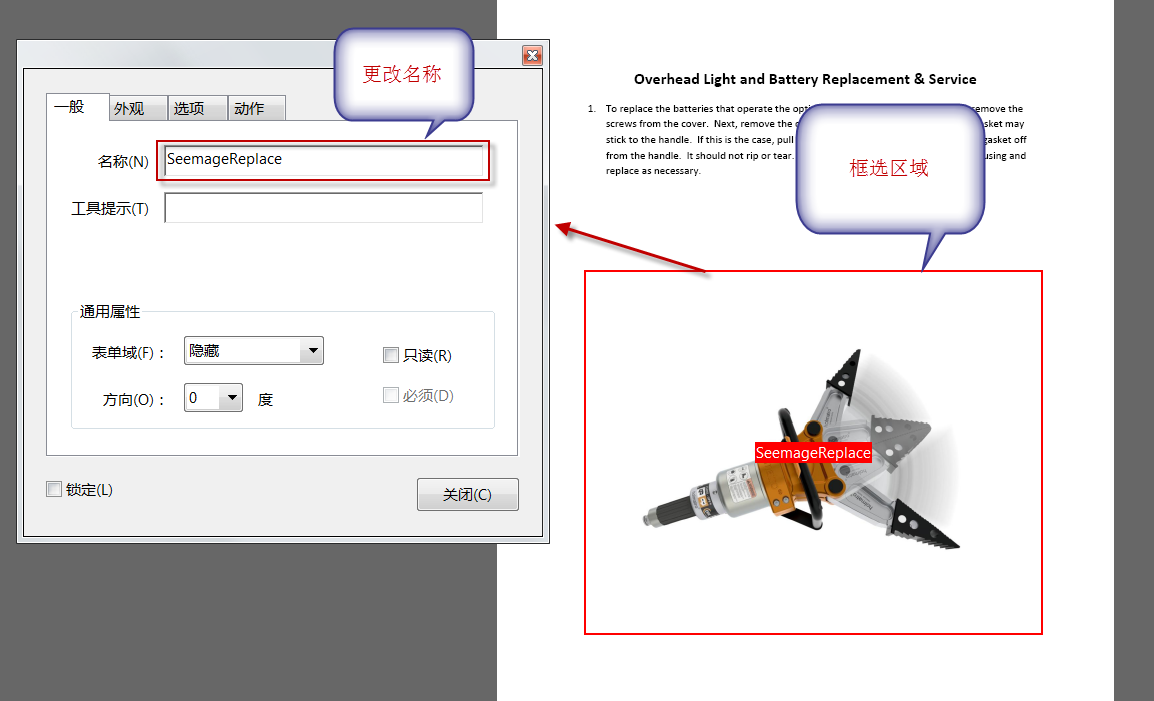 2、框選一個(gè)區(qū)域作為瀏覽3D零件的區(qū)域,并修改該按鈕的名稱為:SeemageReplace,然后保存PDF