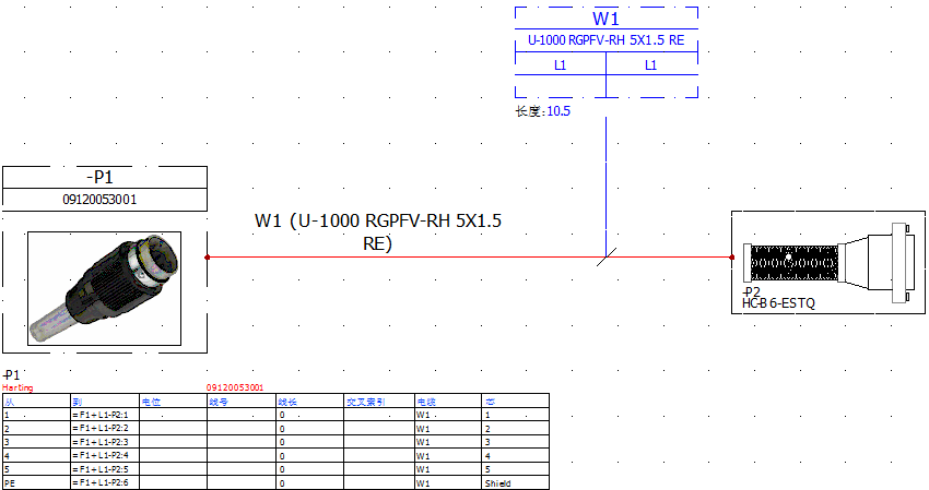 此時,也可以直接雙擊W1進入電纜的屬性界面,設(shè)定具體屬性。例如電纜長度等。在完成設(shè)置后,可以在方框圖中直接使用電纜標(biāo)簽更詳細的詮釋電纜的連接狀況。也可以使用插入接線表的方式更詳細的表述連接器的接線關(guān)系。