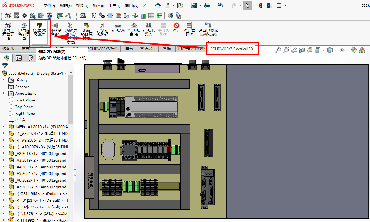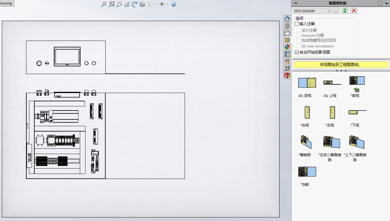 3D機(jī)柜完成布局后,在 “SOLIDWORKS Electrical 3D “選項(xiàng)卡中單擊”創(chuàng)建2D圖紙“命令,創(chuàng)建一個(gè)沒(méi)有圖框的工程圖,如圖1,圖2所示;