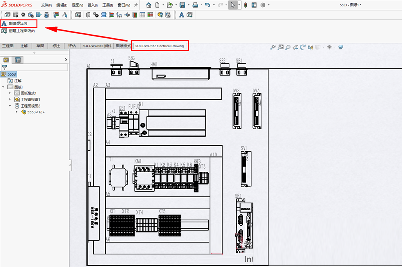 為視圖中的設(shè)備添加標(biāo)注,選中需要添加標(biāo)注的視圖,在“SOLIDWORKS Electrical Drawing“選項(xiàng)卡中,單擊“創(chuàng)建標(biāo)注”,如圖4所示;