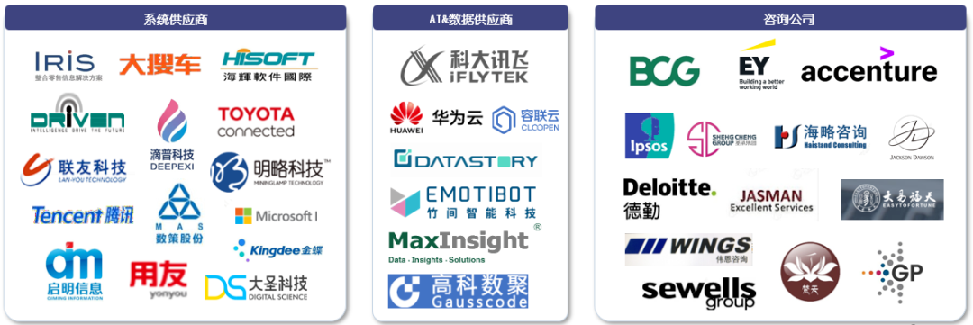 在這里我們梳理了三大分類,分別是系統(tǒng)供應(yīng)商、AI&數(shù)據(jù)供應(yīng)商、以及咨詢公司。系統(tǒng)供應(yīng)商主要給車企提供整套的系統(tǒng)解決方案,或搭載數(shù)字化工具。AI數(shù)據(jù)供應(yīng)商主要是通過數(shù)字化技術(shù)(比如大數(shù)據(jù)、云計(jì)算、人工智能等等),為車企進(jìn)行數(shù)字化產(chǎn)品的提供。咨詢公司則會(huì)通過他們的行業(yè)經(jīng)驗(yàn)與市場(chǎng)洞察,給客戶制定針對(duì)性的解決方案。