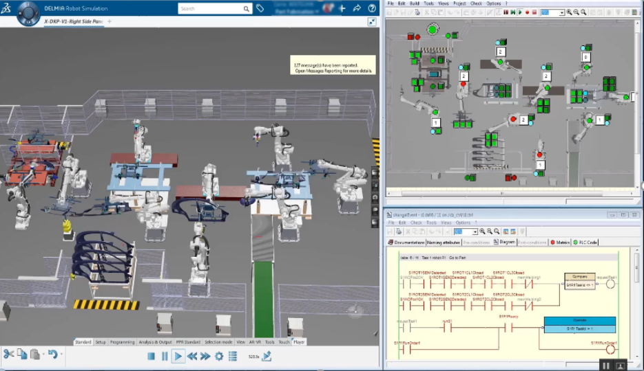 3D體驗(yàn)平臺(tái)支持工程師測(cè)試和調(diào)試所有程序(機(jī)器人,夾具,AGV…),驗(yàn)證I/O和HMI運(yùn)行狀態(tài),并通過(guò)在虛擬模型中創(chuàng)建臨界狀態(tài)來(lái)測(cè)試安全性。通過(guò)虛擬聯(lián)調(diào),可驗(yàn)證PLC程序、機(jī)器人程序、電氣/氣動(dòng)邏輯、生產(chǎn)速率等自動(dòng)化生產(chǎn)要素。