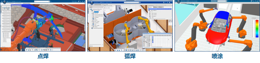 其他作業(yè)類型,3D體驗(yàn)平臺(tái)均支持完善的機(jī)器人仿真與離線編程功能。如點(diǎn)焊(或鉆、鉚接),系統(tǒng)支持鉆、鉚槍以及伺服槍的選擇和作業(yè),支持定點(diǎn)操作的夾具點(diǎn)定義,基于焊點(diǎn)快速生成機(jī)器人軌跡等。