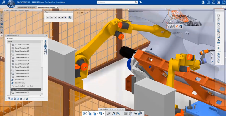 3DEXPERIENCE平臺(tái)提供了一個(gè)集成的虛擬環(huán)境高效地進(jìn)行編程、仿真并優(yōu)化工業(yè)機(jī)器人的行為和任務(wù),同時(shí)所有仿真過(guò)程基于統(tǒng)一的三維沉浸式環(huán)境完成。平臺(tái)內(nèi)包括超過(guò)1500多種工業(yè)機(jī)器人模型和標(biāo)準(zhǔn)焊槍,具備搬運(yùn)、點(diǎn)焊、弧焊、機(jī)加、噴涂、鉚接、噴丸等多樣性專業(yè)作業(yè)仿真能力,工程師可以基于特定作業(yè)類型非??焖俚剡M(jìn)行機(jī)器人的離線編程和仿真。