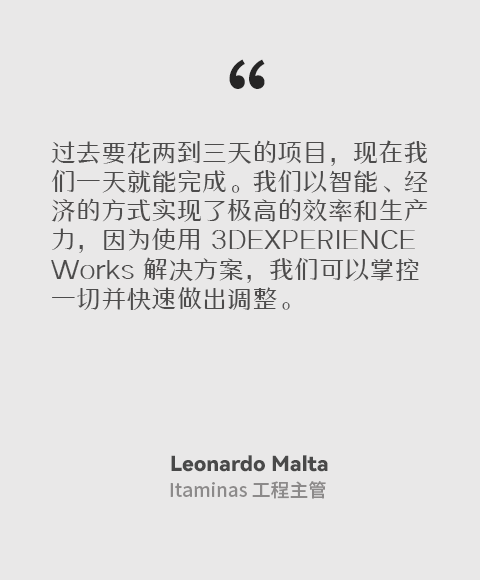 “借助 3DEXPERIENCE Works 解決方案,產(chǎn)品上市時(shí)間加快了大約 60%,因?yàn)樵O(shè)計(jì)師和工程師可以在云端訪問項(xiàng)目信息和完整的項(xiàng)目設(shè)計(jì),而無需前往客戶現(xiàn)場或辦公室內(nèi),”Itaminas 工程主管 Leonardo Malta 指出?!斑^去要花兩到三天的項(xiàng)目,現(xiàn)在我們一天就能完成。我們以智能、經(jīng)濟(jì)的方式實(shí)現(xiàn)了極高的效率和生產(chǎn)力,因?yàn)槭褂?3DEXPERIENCE Works 解決方案,我們可以掌控一切并快速做出調(diào)整?!?/span>