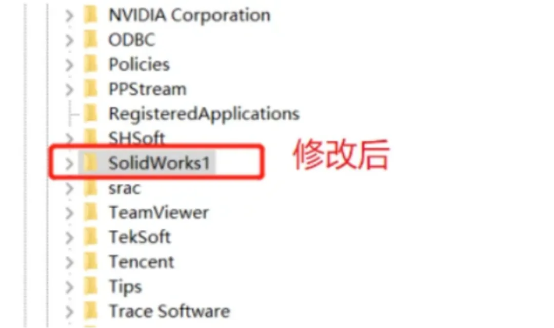 | 在彈出的右鍵菜單中,選擇“重命名”選項。然后,將文件夾名稱從“solidworks”更改為“solidworks1”或其他任何您喜歡的名稱,只要確保它與原名稱不同即可。這一步的目的是為了將原有的SolidWorks注冊表設置暫時隔離,以便軟件能夠恢復到默認狀態(tài)。 |