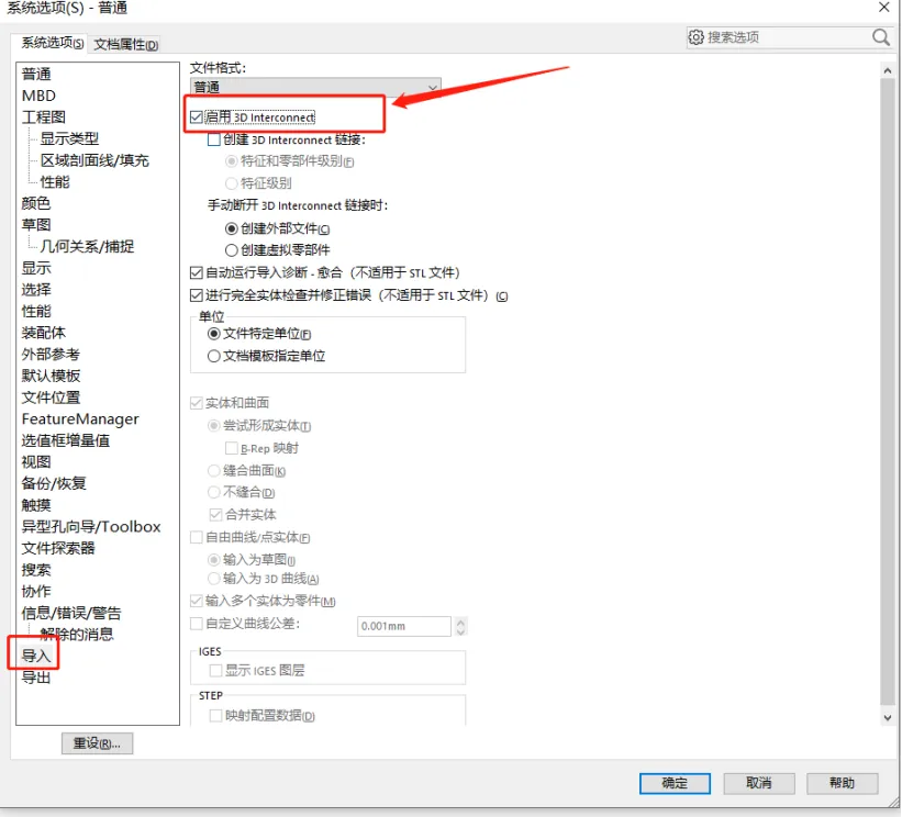 | 在系統(tǒng)選項(xiàng)中,找到與導(dǎo)入相關(guān)的設(shè)置,特別是“啟用3D Interconnect”這一選項(xiàng)。通常,這一選項(xiàng)是為了保持與其他CAD軟件的實(shí)時(shí)數(shù)據(jù)鏈接而設(shè)置的。但是,在打開中間格式文件時(shí),由于數(shù)據(jù)兼容性問題,可能會(huì)導(dǎo)致模型出錯(cuò)或變形。因此,建議取消勾選“啟用3D Interconnect”。 |