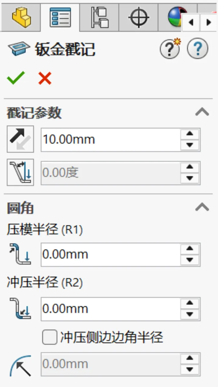 | 設(shè)置戳記參數(shù) 完成草圖繪制后,PropertyManager 會自動彈出,其中包含了一系列戳記參數(shù)設(shè)置選項。設(shè)計師根據(jù)實際需求,在對應(yīng)的參數(shù)欄中輸入合適的值,對戳記的深度、方向、拔模角度以及圓角等參數(shù)進行設(shè)置。設(shè)置完成并確認(rèn)無誤后,點擊 “確定” 按鈕,即可在鈑金零件上生成所需的戳記特征. |